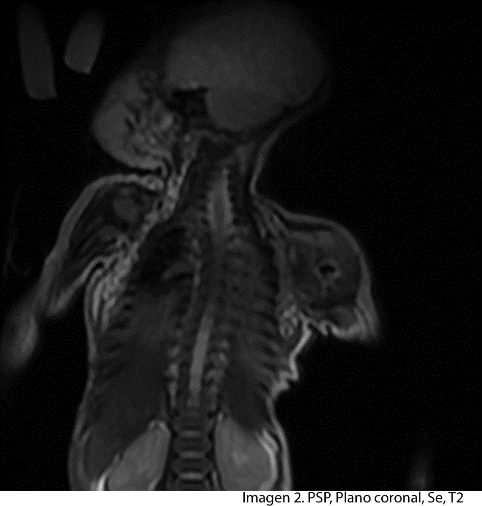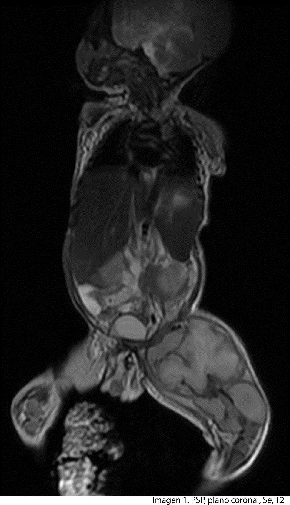 Paciente de 2 años de edad, madre refiere que después de un año de vida inicia con cambios de coloración y aumento de volumen en muslo izquierdo, seis meses después inicia a observar el mismo problema a nivel del hombro izquierdo, por lo que consulta a facultativo, el cual solicita estudio de resonancia de cuerpo entero, enfocado a muslo y hombro izquierdo.