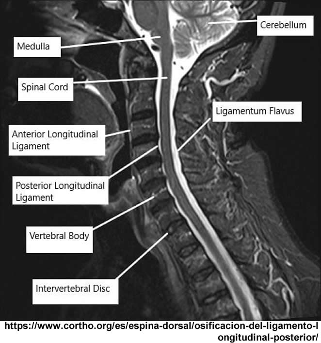 Se observa hipo intensidad del ligamento longitudinal anterior y posterior de la columna cervical, también se observa perdida de la movilidad y rigidez de la misma, los ligamentos interespinosos se ven hipointensos en T2 y en T1, al igual que el pliegue nucal, lo que sugiere calcificación de estas estructuras anatómicas.