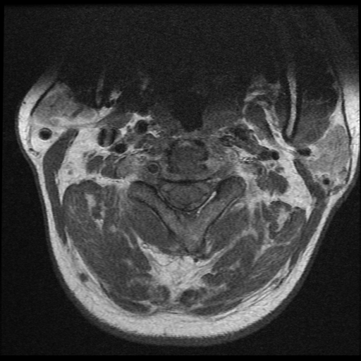 Paciente de 37 años de edad, no refiere trauma reciente, indica que hace mas o menos dos años inicio con dolor a nivel del cuello, y empezó a notar que el mismo se estaba inclinando hacia el lado izquierdo, esta inclinación ha ido en aumento y no le permite colocar el cuello de forma recta, causándole dolor e incomodidad. Acude a consulta y luego de ser evaluado por facultativo le solicitan estudio de resonancia magnética de columna cervical.