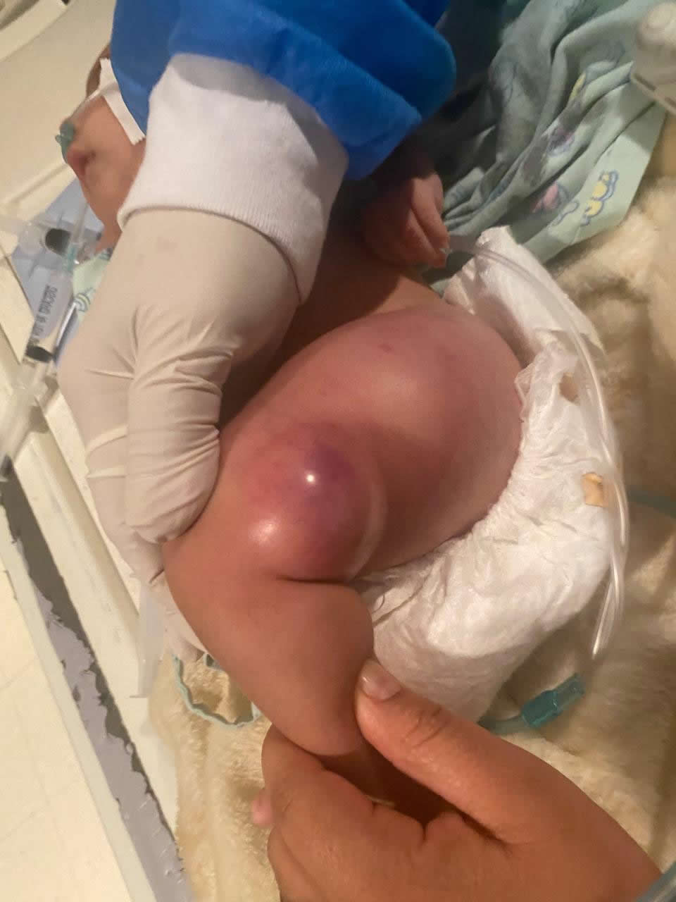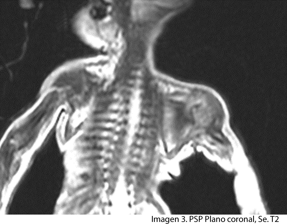Paciente de 2 años de edad, madre refiere que después de un año de vida inicia con cambios de coloración y aumento de volumen en muslo izquierdo, seis meses después inicia a observar el mismo problema a nivel del hombro izquierdo, por lo que consulta a facultativo, el cual solicita estudio de resonancia de cuerpo entero, enfocado a muslo y hombro izquierdo.